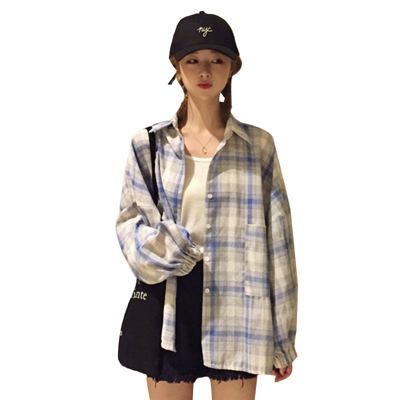 / 夏季女裝韓版中長款燈籠袖格子翻領長袖襯衣寬松休閑襯衫上衣外套