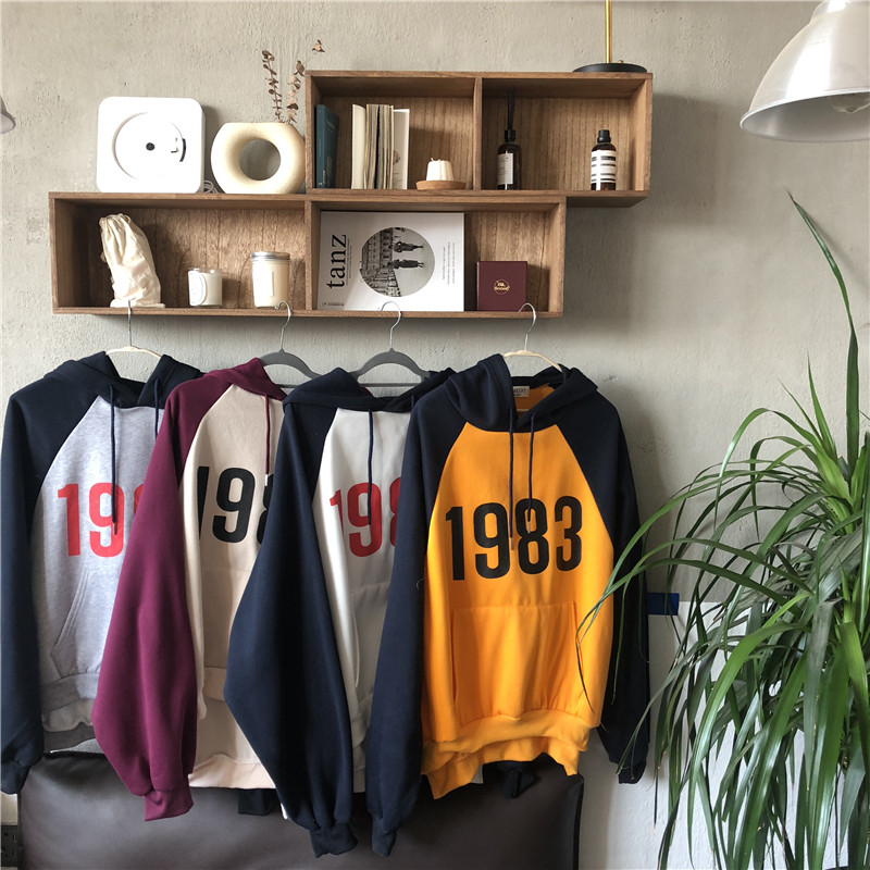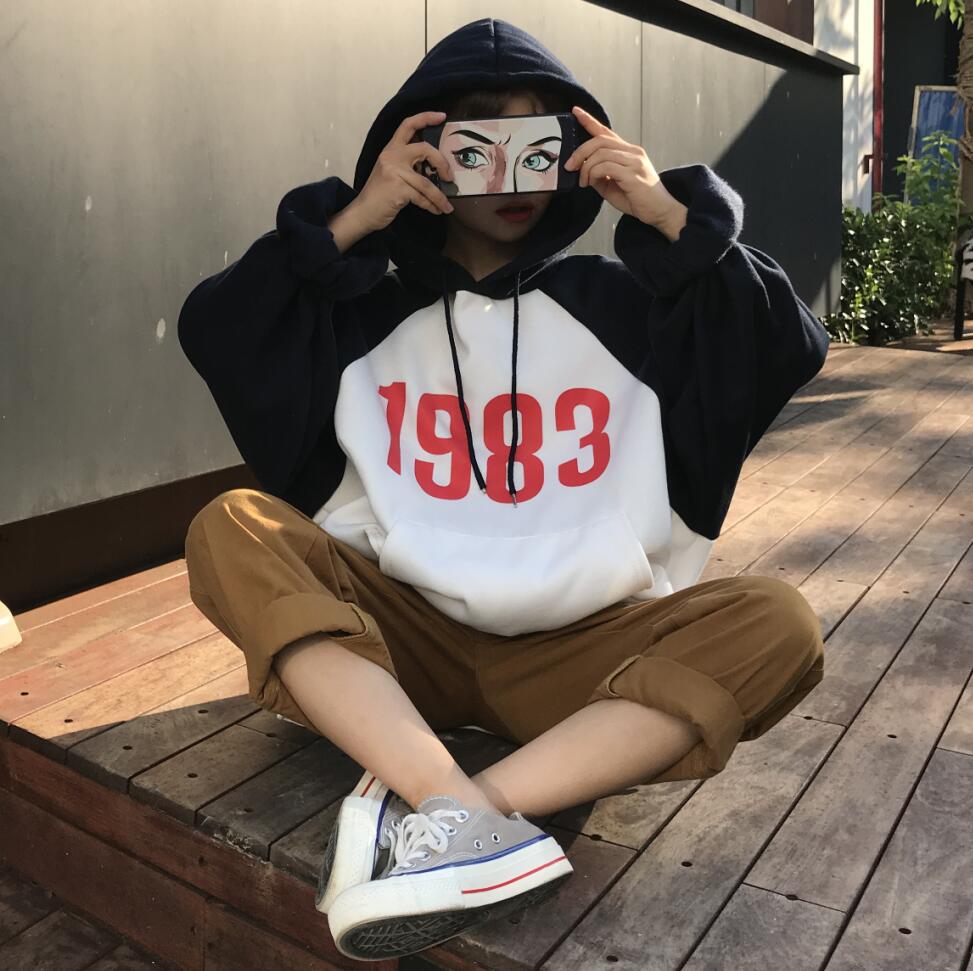 / 秋冬女裝韓版BF風寬松拼色數字加絨加厚連帽慵懶風超火酷衛衣外套