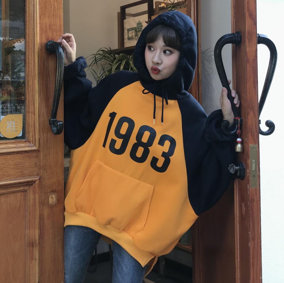 秋冬女裝韓版BF風寬松拼色數字加絨加厚連帽慵懶風超火酷衛衣外套