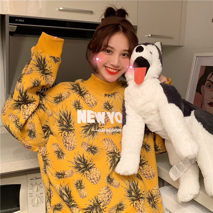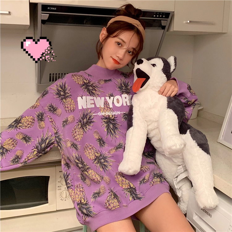 2018新款秋冬韓版中長款原宿風菠蘿字母小高領加絨加厚衛衣外套女