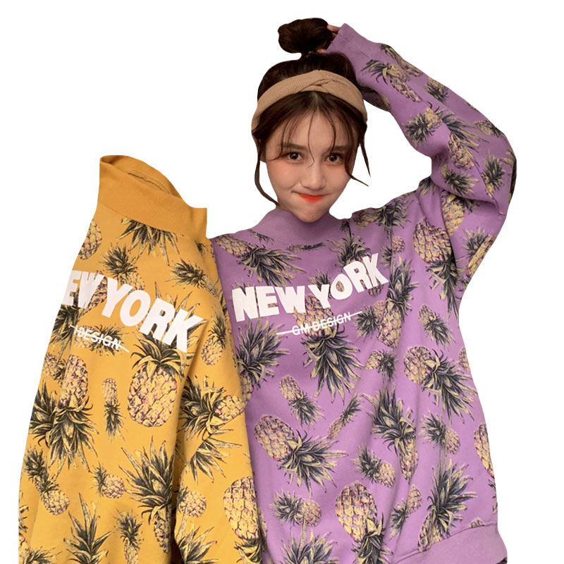 / 2018新款秋冬韓版中長款原宿風菠蘿字母小高領加絨加厚衛衣外套女