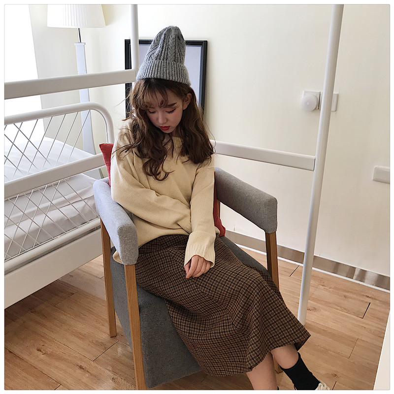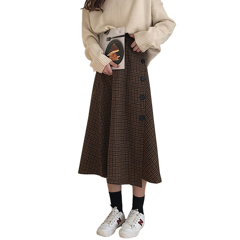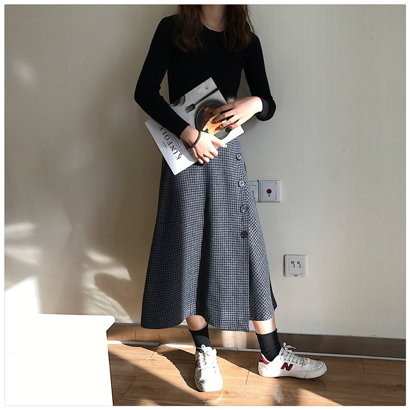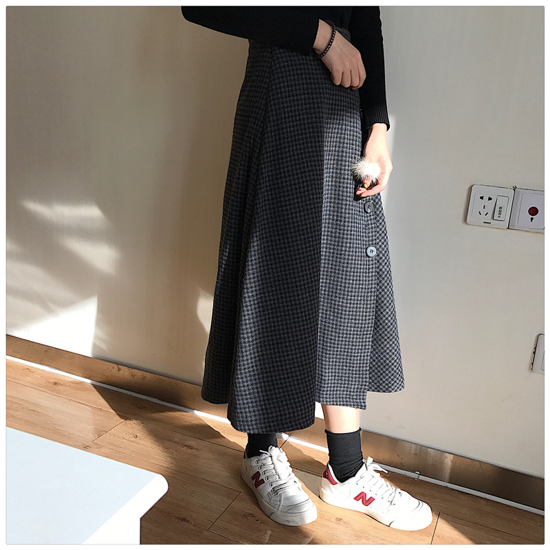 / 秋季韓版側邊紐扣不規則復古細格紋中長款半身裙高腰A字裙長裙女