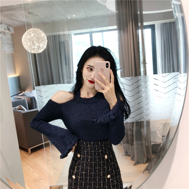 復古露肩心機喇叭袖小清新針織上衣+粗花呢子格子開叉排扣半身裙